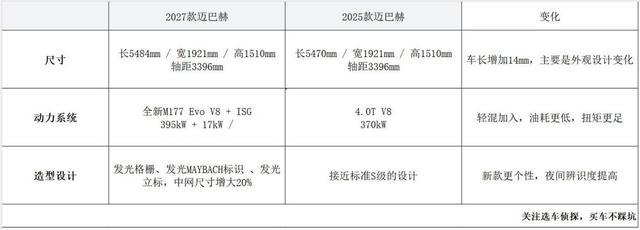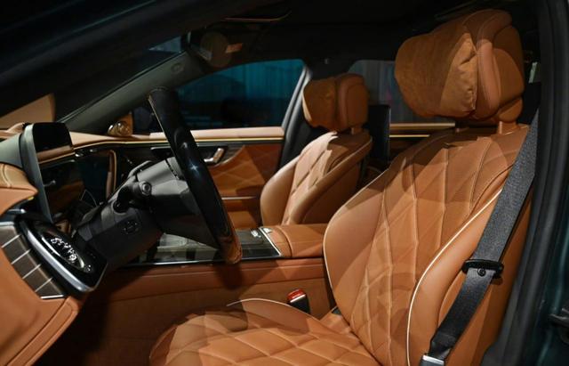 新款的变化在于发光。发光格栅、发光MAYBACH标志及发光三叉星徽立标,和洽尺寸增大的竖直进气格栅,让车头在夜晚更具辨识度和典礼感。而V12车型格栅内的V12专属标志亦然现金莫得的。尺寸方面车身长度加多了14毫米,达到5484毫米,姿态更显修长。