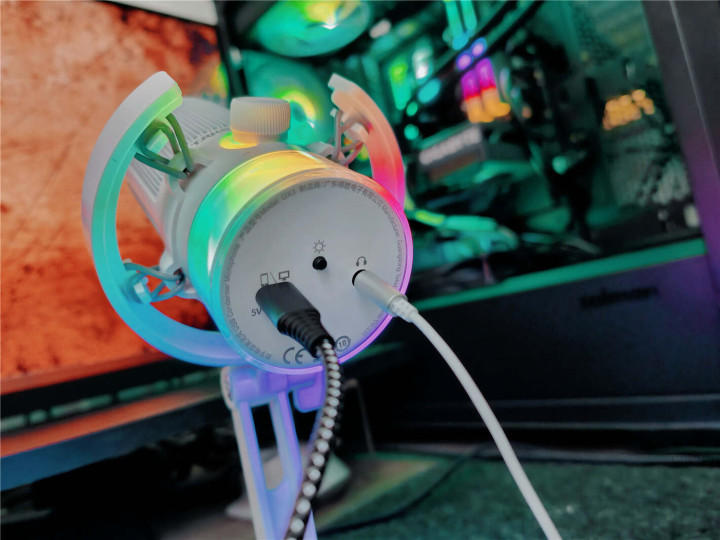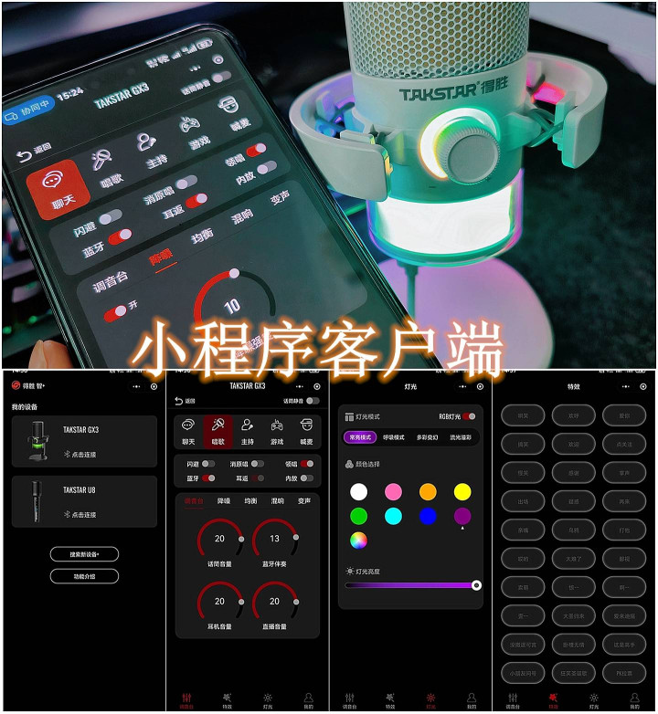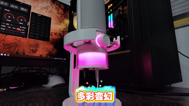 灯效是告捷 GX3 USB电容麦克风的其中一个亮点,升级款在此基础上进一步升级,除了保留前代可通过客户端个性调色、礼貌亮度和呼吸灯花样的功能外,新增了多彩幻化、流光溢彩两种灯光花样。