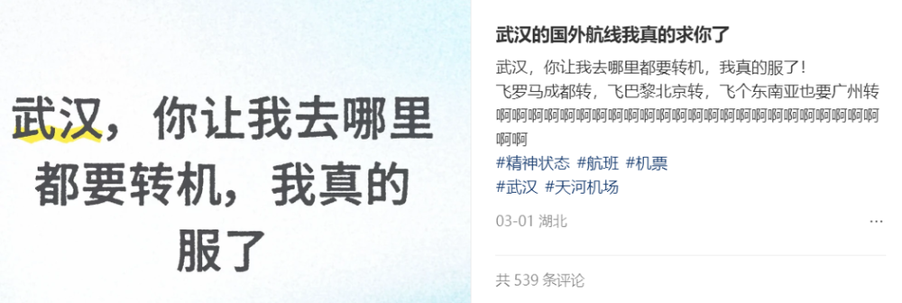 “飞东京要去浦东转,飞大阪得经青岛绕,就连去个清迈齐要在广州兜一圈,从武汉出洋,大部分行程在周折的路上。”