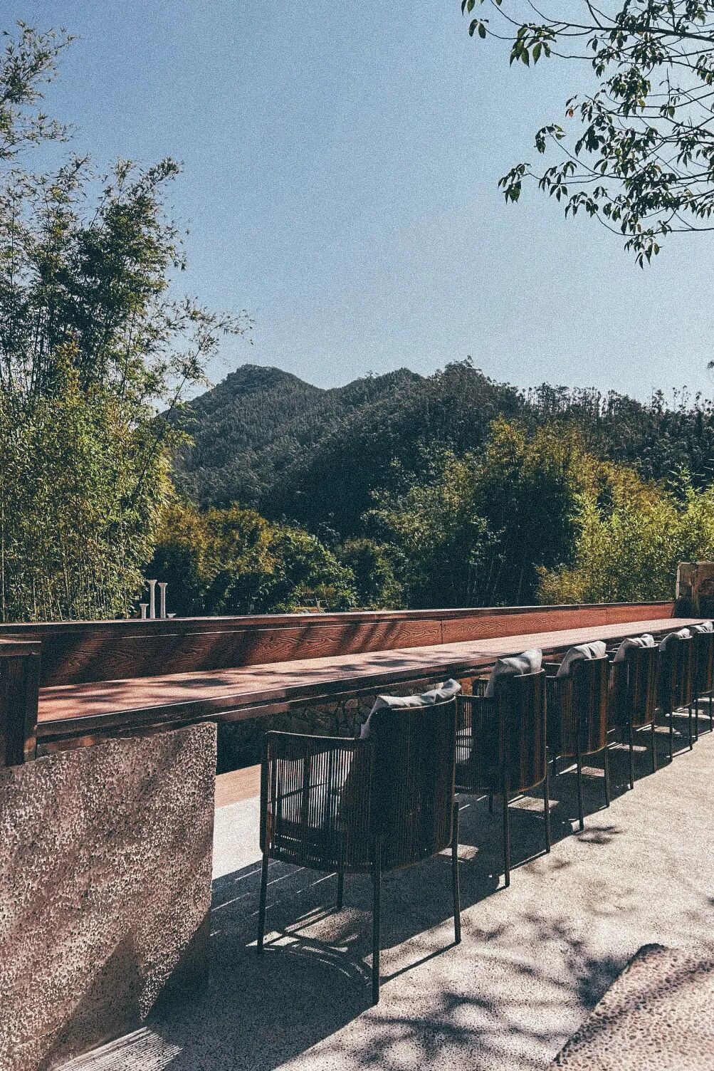 如果念念往山里去,不错摄取民宿——未迟·山下四时。驱车赶赴那条被当地东谈主称作“最好意思山路”的218公路。公路从城市边缘空闲爬升,一起是大片竹林与果树,远方的山线渐渐显显现来。罗浮山余脉在天空线后方铺张开,霏霏经常停留在山腰,看上去像一层莫得实足散去的水墨。