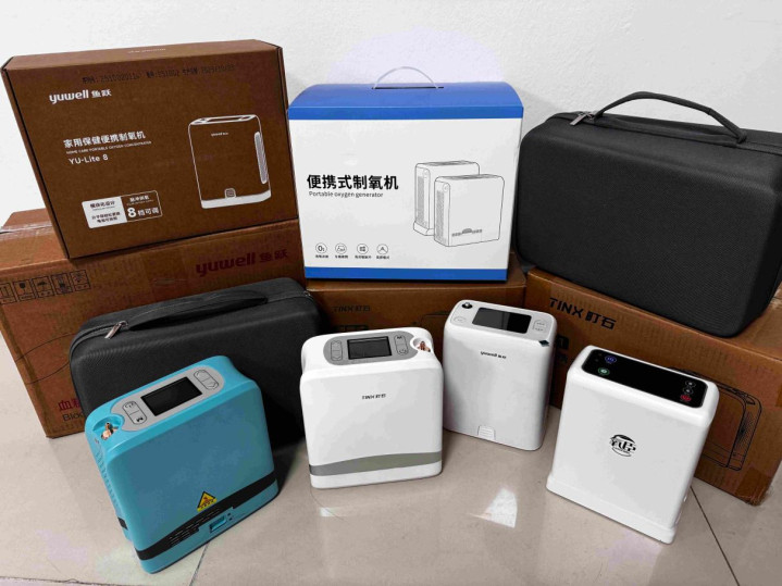 本次实测的 6 款制氧机型号鉴识是:町石 tinx Y1 便携制氧机、瑞迈特 S01 5A 制氧机、嘉医 S1-A 便携制氧机、万康龙 ZY-5HW 制氧机、华灵康 P6-A 便携制氧机、迈卓 JAY-5AW 制氧机。