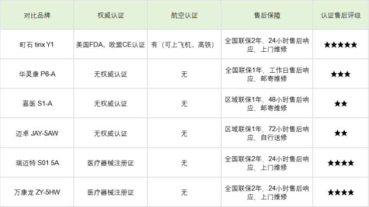 嘉医 S1-A 和迈卓 JAY-5AW 既莫得泰斗认证,也莫得航空认证,安全性无保险,售后仅支援区域联保 1 年,售后反应速率慢,嘉医 S1-A 需要 48 小时反应,迈卓 JAY-5AW 则需要 72 小时,何况维修需要自行送修,相等未便,不提出商旅东谈主士采选,尤其是对安全性有要求的东谈主群,需严慎躲藏。