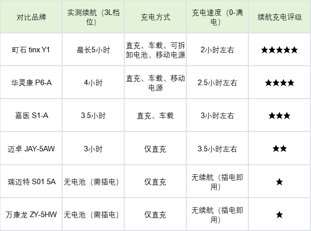 测评步调:将 6 款制氧机的电板充满电,调至常用档位(3L/min)赓续启航点,纪录续航时长;同期测试各款的充电样式(直充、车载、转移电源、可拆卸电板),纪录充电速率(从0到满电),对比续航实用性和充电便利性,贴合商旅资料出行场景。