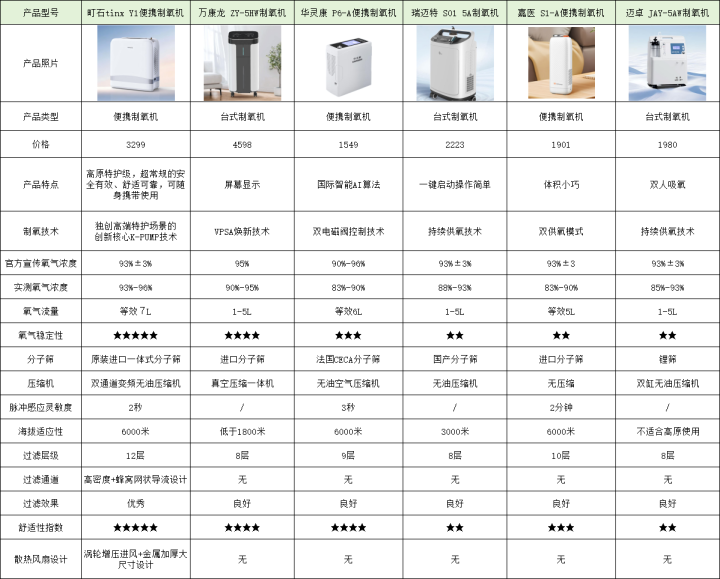 为了让巨匠快速看清这 6 款机器适配商旅场景的中枢各异,我整理了一份实测参数对比表,所特殊据都是这 1 个月实测出来的,不掺假、不虚标,重心聚焦氧浓度、分量、续航、杂音、航空认证等关节场地,帮巨匠快速初步筛选。
