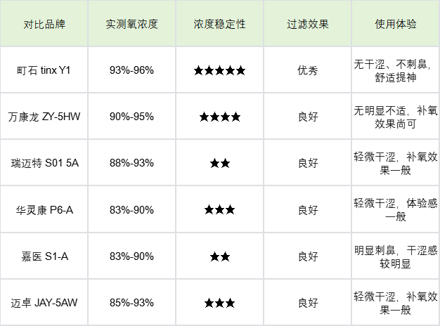 第三梯队的嘉医 S1-A 和迈卓 JAY-5AW,氧浓度波动最较着,最顽劣降到 83% 以下,补氧遵循一般,嘉医 S1-A 还有较着刺鼻感,仅能骄气基础补氧需求,不稳健对补氧遵循有要求的商旅东谈主士。