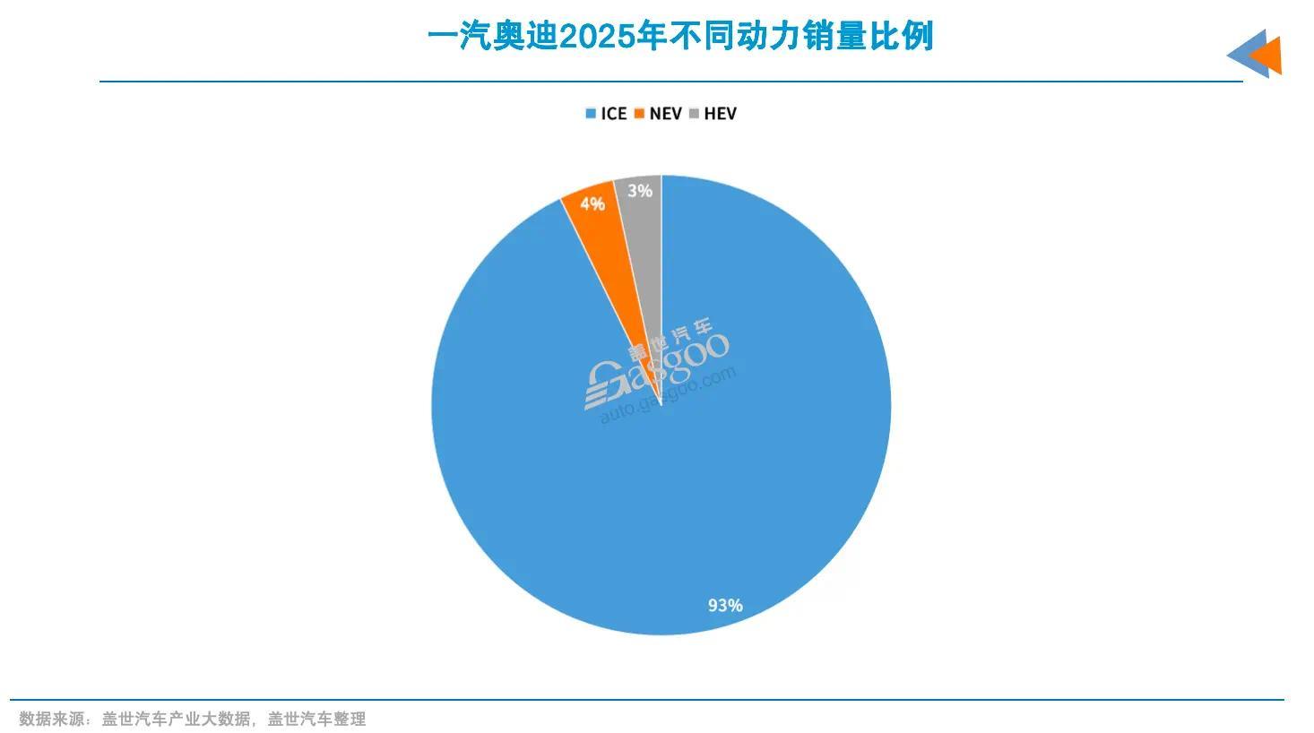 盖世汽车产业大数据浮现,2025年,一汽奥迪燃油车累计销量约56.1万辆,占比高达约96%,新能源车型同期销量仅2.3万辆。与此同期,中国新能源乘用车浸透率已冲破50%,全体产销规模超1200万辆。