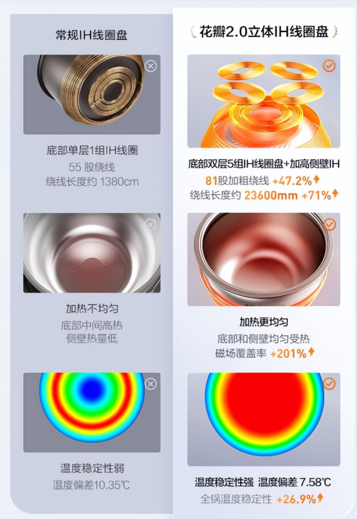 好意思的这条阶梯最典型的点是其行业开创的立体花瓣2.0 IH加热技能:底部由5组花瓣线圈构成,配合加高侧壁IH,让线圈像花瓣相同包裹内胆,从而完满更广的加热掩饰,加热面积提高201%,让热量更均匀地参加整锅。