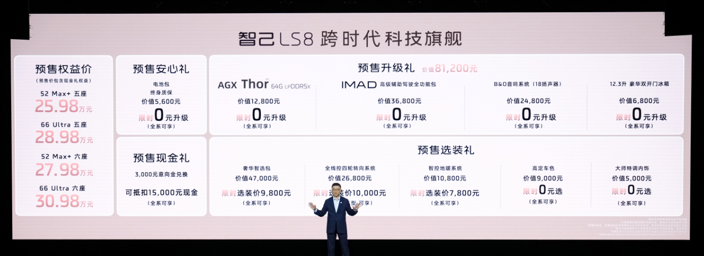 3月26日,智己LS8负责开启预售,推出大五座与大六座双版块,预售权柄价25.98万-30.98万元。当作上汽集团手艺集大成之作,这款中大型科技旗舰SUV,精确对准追求品性、安全与平安的家庭用户,以百万级硬件、全域智能与超长续航,再行界说30万级SUV价值上限,号称现代品性家庭的“闭眼入”之选。