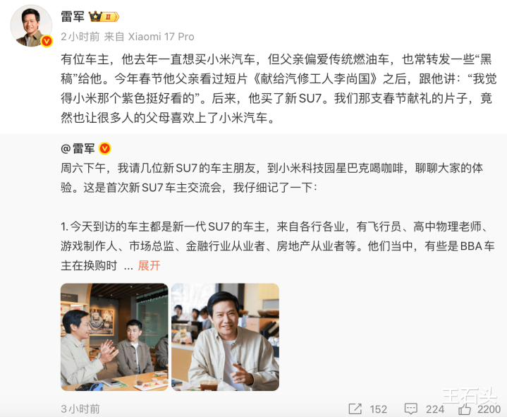 刻下,雷军切身接见了几位SU7车主一又友,这其中就有不少东说念主恰是从BBA阵营转投而来,何况小米新SU7车主中,许多齐是来自BBA车主。