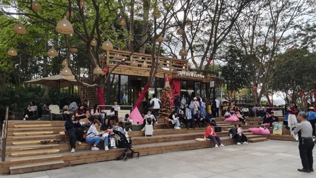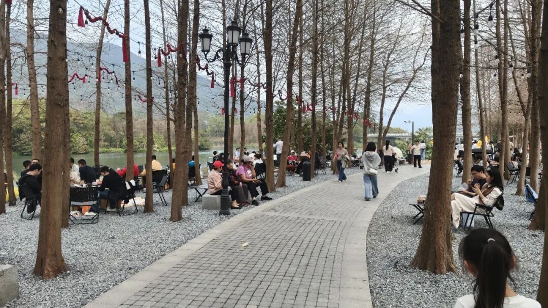 在彩虹桥驿站,流溪河边惬心如画。水面上,皮划艇爱好者挥桨前行,激起阵阵漂泊;岸边的咖啡角座无隙地,搭客们手持饮品打卡拍照,将碧水蓝天定格成新春最好意思风物。
